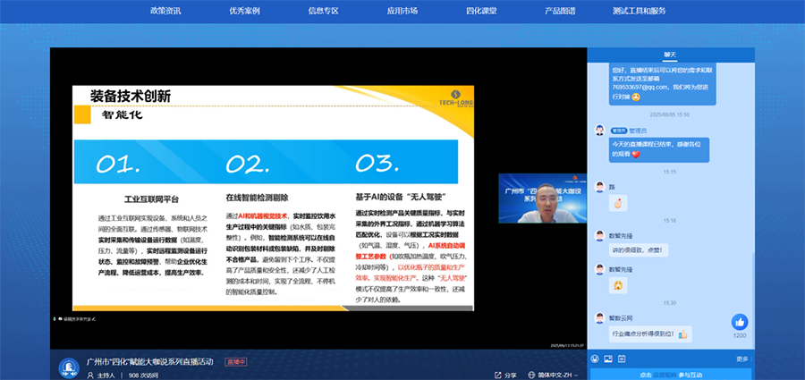 ????2025年6月19日,在廣州市工業(yè)和信息化局的精心指導(dǎo)下,廣州市“四化”賦能大咖說系列直播第二期圓滿舉辦。本次活動聚焦制造業(yè)數(shù)字化、網(wǎng)絡(luò)化、智能化、綠色化轉(zhuǎn)型路徑探索,作為行業(yè)轉(zhuǎn)型標桿企業(yè),達意隆受市工信局邀請,由公司監(jiān)事、企劃部副總監(jiān)兼高級工程師梁殿勝代表出席,圍繞包裝裝備與食品行業(yè)實戰(zhàn)經(jīng)驗,介紹并分享數(shù)字化智能化經(jīng)驗,與行業(yè)同仁共話“四化”轉(zhuǎn)型新未來。