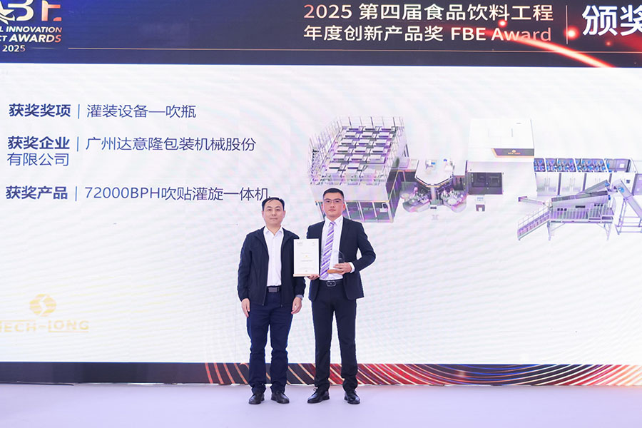 2025年10月28日,達意隆憑借其推出的72000BPH吹貼灌旋一體機,在眾多參賽成果中脫穎而出,榮膺“第四屆食品飲料工程年度創(chuàng)新產(chǎn)品獎(FBE Award 2025)”。該獎項不僅是對達意隆在液態(tài)包裝領(lǐng)域持續(xù)創(chuàng)新與技術(shù)深耕的高度認可,更充分體現(xiàn)了其在幫助客戶降本增效、推動行業(yè)可持續(xù)發(fā)展方面所展現(xiàn)的技術(shù)實力與卓越價值。